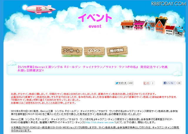 アイドルグループ・Berryz工房が開催を予定している新シングル発売記念イベントの“印刷した直筆サイン色紙”をプレゼントするという内容をめぐりファンから不満の声が多数あがっていた件について、同グループが所属するハロー!プロジェクトは告知内容に誤りがあったとして公式サイト上で謝罪した。