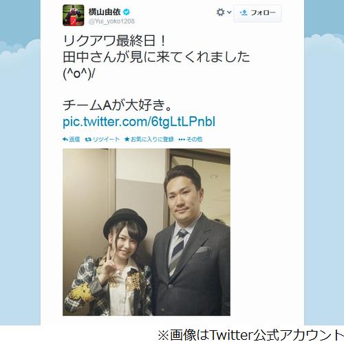 ニューヨーク・ヤンキースへ7年総額161億円で移籍が決まった“161億円の男”こと田中将大投手(25歳)が1月26日、大ファンのアイドルグループ・AKB48のライブを訪れ、チームAキャプテンの横山由依(21歳)とツーショット写真を撮影。横山がTwitterで公開し、話題を呼んでいる。