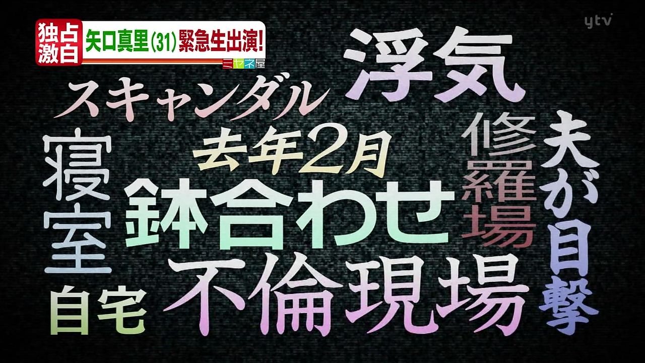 番組冒頭から出演した矢口は「みなさん、ご無沙汰しております。このたびは、私ごとで大変お騒がせして申し訳ございませんでした」と陳謝。番組の司会者・宮根誠司らを前に「すべて私が悪いと思ってます。(不倫の)きっかけは私です」などと、およそ1時間20分にわたり、今の心境や今後について話をした。
