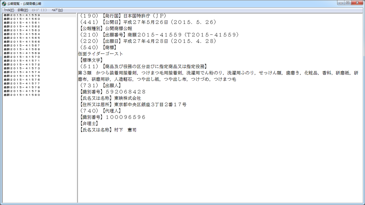 東映株式会社名義で『仮面ライダーゴースト』の商標が、4月28日特許庁に出願されていたことが分かった。
