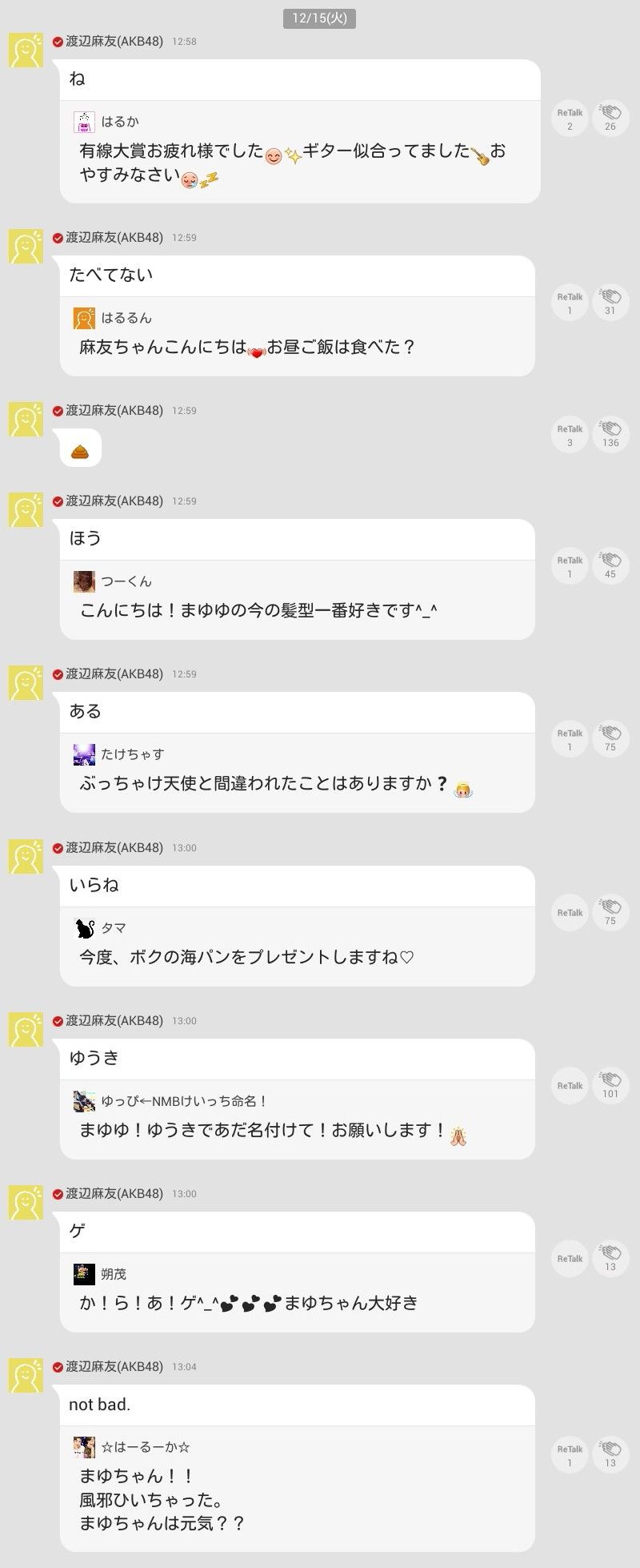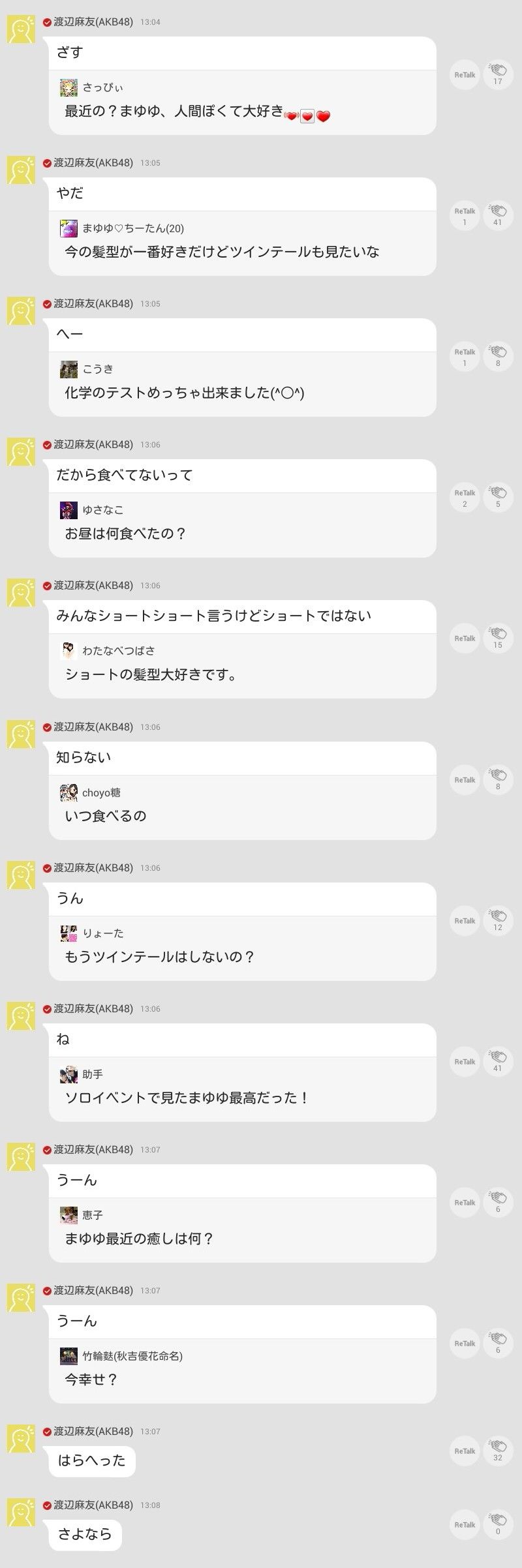 また、「今度、ボクの海パンをプレゼントしますね」との質問には「いらね」とばっさり切り、「ツインテールも見たいな」という言葉には「やだ」と回答。ツインテールは以前の渡辺のトレードマークとなっていた髪型なだけに、ファンからは「まゆゆはもうアイドルやりたくないのかな?」などという声が上がった。